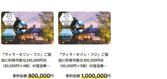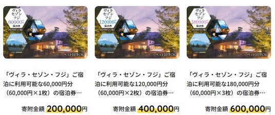 宿泊券の種類は「6万円<20万円の 寄付>」「12万円<40万円の寄付 >」「18万円<60万円の寄付>」 「24万円<80万円の寄付>」「30 万円<100万円の寄付>」と全部で 5種類。