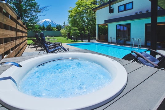 プール&ジャグジー富士山を見ながら入れる自分だけの専用ジャグジーが大好評。プライベートプールは、4/末~10/末まで温水になりますが、それ以外の期間もプールデッキでの滞在をお楽しみいただく為、1年中利用できるジャグジーを本年設置、夜には七⾊に変化する光の美しさも楽しめます。