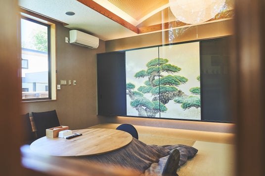 畳の和室リビングで本格カラオケ敷地内、多目的スペースの入口には、和室リビン グとカラオケを設けました。印象的な松の襖を開 けると大型テレビがあり、畳の上でおくつろぎ頂 けます。冬は炬燵になる大きなテーブルでみかんを食べながら、カラオケで大いに日ごろのストレスを発散してください。
