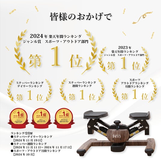 総合フィットネスクラブやアプリ、フィットネス商品で健康をサポートする株式会社スポーツオアシス(本社:東京都墨田区、代表取締役社長:吉田 智宣、以下「オアシス」)の「ツイストエアロステッパー」が、「楽天年間ランキング2024」のスポーツ・アウトドアジャンルにて第1位を2年連続受賞いたしました。