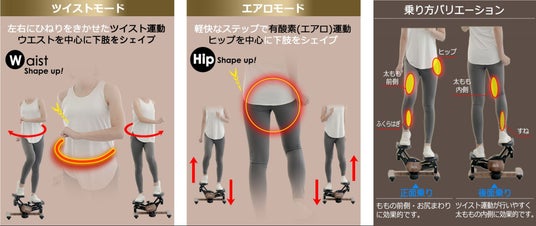 – 「エアロモード」での上下の運動と「ツイストモード」でのひねりの運動ができることで、ウエストや内腿の筋肉をしっかり使うことができます