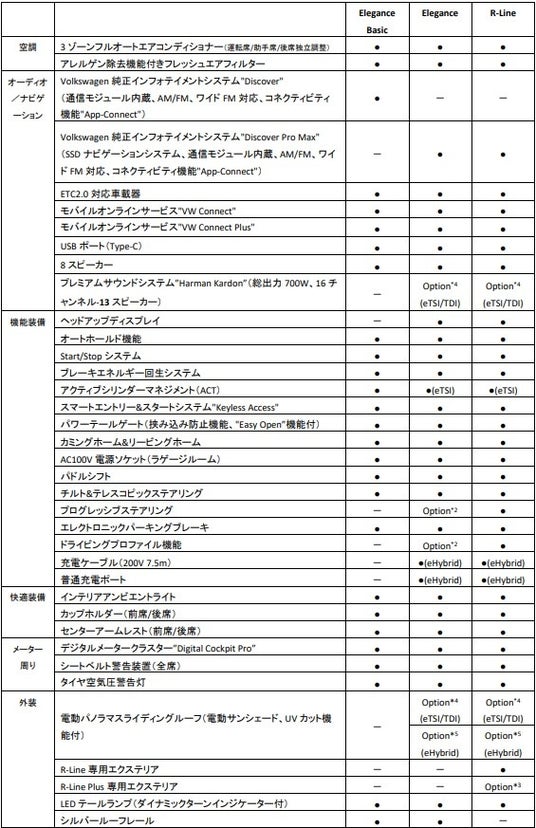 グレードは、”Travel Assist”やレーンキープアシストシステム”Lane Assist”、 レーンチェンジアシストシステム”Side Assist Plus”などの最新の運転支援システムをすべて標準装備とした『Elegance Basic』(1.5eTSIのみ)をエントリーグレードに設定し、15インチの大型タッチディスプレイを備えた純正インフォテイメントシステム”Discover Pro Max”やヘッドアップディスプレイを標準装備した『Elegance』、そして専用エクステリアを身に纏い、専用シートや19インチアルミホイールを装着した『R-Line』の3グレードを設定し、計7グレード展開となります。