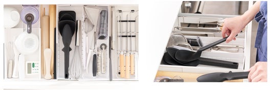 干渉しあって取り出しにくいキッチンツールが2ステップ(持ち上げる・引き抜く)で簡単に抜ける。