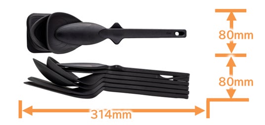 貝印の調査によると、「キッチンツールは数が多くなり収納に困る」「どのように収納したら良いか分からない」といった声が多くありました。 「kasanaru」は5種類全てのツールを重ねて、引き出しに寝かせて収納することができます。スタッキング時のサイズは全長314mm、高さ80mmと日本のキッチンに合わせたサイズ設計で、キッチンの引き出しに横向きで収納することができる点で特許※2を取得しています。様々なキッチンツールを必要とするご家庭のキッチンにも収納できるサイズです。