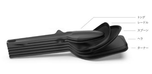 今回登場する「kasanaru」は、収納場所に困りがちなキッチンツールを、重ねてコンパクトに収納できます。製品ラインナップは、スプーン、レードル、ヘラ、ターナー、トングの5種類と、全てがセットになった5本セットの6種類です。