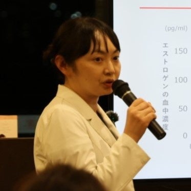 はじめに、女性ホルモンと更年期に関する基礎知識について大島医師が解説しました。大島医師は「妊娠・出産や美と健康に深い関わりをもつエストロゲン、プロゲステロンの2種類の女性ホルモンは、生理周期や生涯の間で分泌量が変化するものです。」と女性ホルモンについて解説しながら、閉経前後に減少するエストロゲンの分泌量に対して「波を打つようにガタガタと減っていくのが更年期の特徴。元気な日、調子が悪い日を交互に感じたりするのは、ごく微量な女性ホルモンの変化が大きく身体に影響しているという証拠なのです。」と、女性ホルモンと更年期の関わりについても解説しました。