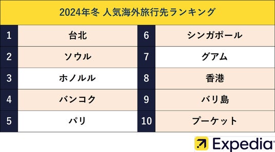 エクスペディアの検索データ※1による「2024年 冬の人気海外旅行先ランキング※1」を見てみると、1位は「台北」、2位には「ソウル」とアジアの王道人気都市、3位には不動の人気を誇る「ホノルル」が入り、上位3位は9月に発表した「2024年 秋の人気海外旅行先ランキング」と同じ組み合わせとなりました。一方で、夏と秋は「ソウル」が首位だったものの、今回は「台北」が首位となりました。「ソウル」は冬の冷え込みが厳しいため、この季節は比較的暖かい「台北」を選ぶ人の方が多いのかもしれません。その他をみると、4位に「バンコク」、6位に「シンガポール」、8位に「香港」、9位に「バリ島」、10位に「プーケット」と、アジアの旅行先がTOP10のうち7つを占めています。気温や円安などの状況からか、冬シーズンは東南アジアの暖かいエリアに興味を持つ人が多いようです。