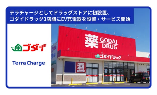 電気自動車(EV)向け充電サービス「Terra Charge(テラチャージ)」を展開するTerra Charge 株式会社(本社:東京都港区、代表取締役社長:徳重徹、以下「当社」)は、ゴダイ株式会社(本社:兵庫県姫路市、代表取締役社長 浦上 卓也、以下「ゴダイ」)が運営する、ゴダイドラッグ龍野北店(兵庫県たつの市)、ゴダイドラッグ山南店(兵庫県丹波市)、ゴダイドラッグ美作江見店(岡山県美作市)の3店舗に計12口(基)のEV充電器を設置し、2024年11月22日からサービス提供を開始いたします。