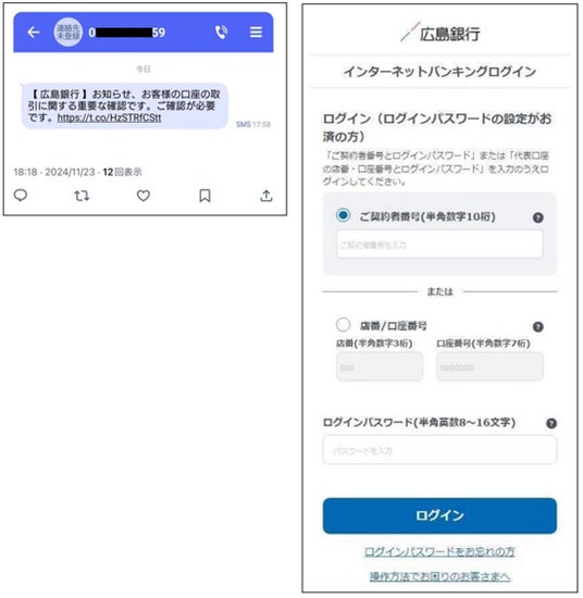 株式会社広島銀行(代表取締役頭取 清宗 一男)では、11月23日(土)18時頃、当行を装った偽SMS(ショートメッセージ)・偽サイトが確認されました。お客さまが不正送金に遭われる被害も複数確認されていることを受け、注意喚起としてお知らせいたします。