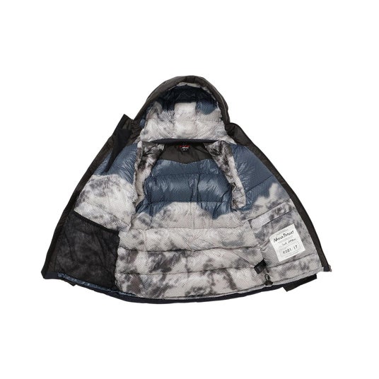 ナンガのフラッグシップモデルである「AURORA TEX LIGHT DOWN JACKET MIKAMI」をベースに、表地の配色をブラック×ネイビーに変更。裏地には石川直樹氏が撮影したナンガ・パルバットをドットを交えながらプリントしました。