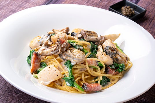 【メニュー名】北海道サロマ湖産カキとホタテ、「農家のベーコン」のクリームソース