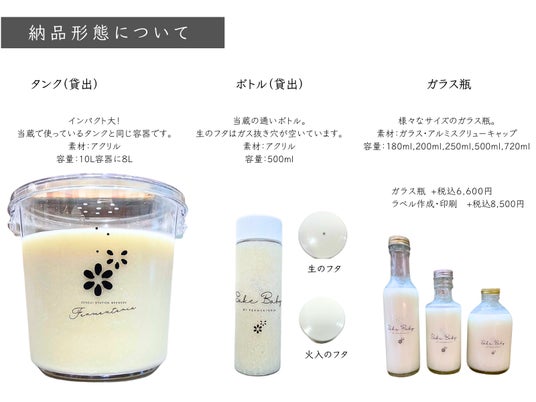 【夢のタンク買い】インパクト大!当蔵のタンクと同形状の容器やボトル(貸出)をご用意しております。オリジナルラベルを貼ったボトルでの納品も可能です(火入れのみ対応)。