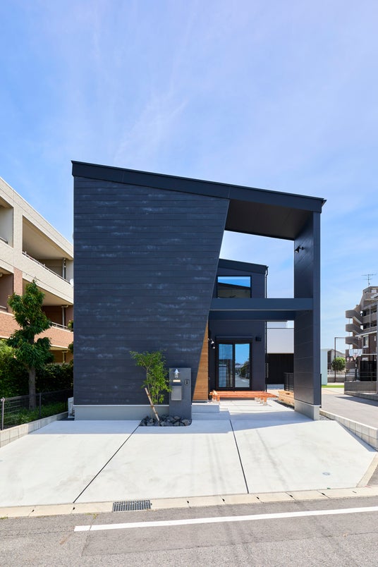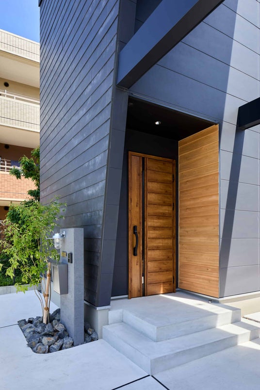 正面のファザードにはSOLIDOを大きく使用しました。凹凸感が特徴的な外観はスタイリッシュでかっこいい印象に仕上がっています。また玄関の一部に木調のアクセント外壁を採用することで、斜め壁から覗くデザインがアクセントになっています。