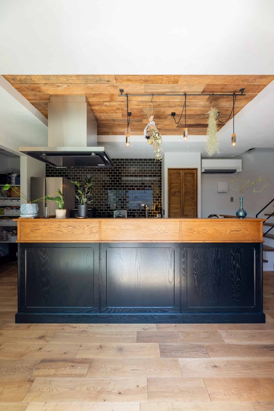 キッチン周りには造作で腰壁を設えました。キッチンの手元を隠し、生活感が見えないよう高さを工夫しています。ブラック塗装が良いコントラストになっておりオーク材の風合いが室内ともマッチしています。また無垢の床に合わせてキッチンの天井にはお施主様こだわりの古材のパネルを貼り上げました。