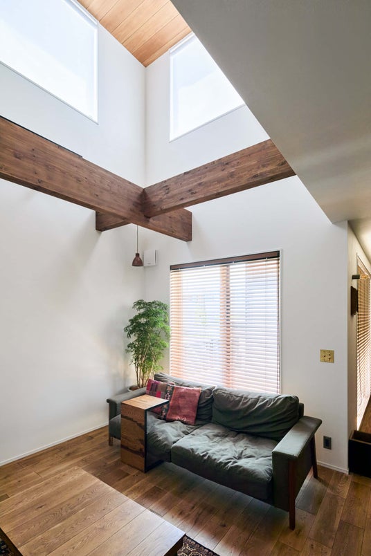 吹抜けリビングには化粧梁を大きく出しました。あえて化粧梁の太さを変え交差させることで、デザインの一部として愉しむことができます。