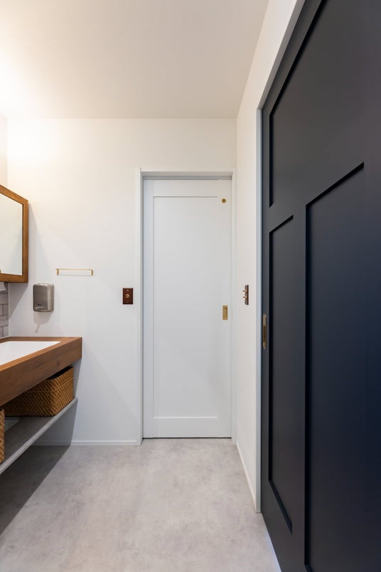 脱衣室⇔洗面⇔ランドリールームと目的にあわせて空間を分けました。脱衣室には2本の物干しバーで室内干しスペースをたっぷり確保しています。ランドリールームは扉で仕切ることで生活感を隠せる間取りにしました。