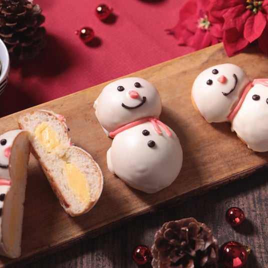 クグロフ生地にカスタードを絞り、ホワイトチョコをコーティングして可愛らしい雪だるま形に仕上げました。