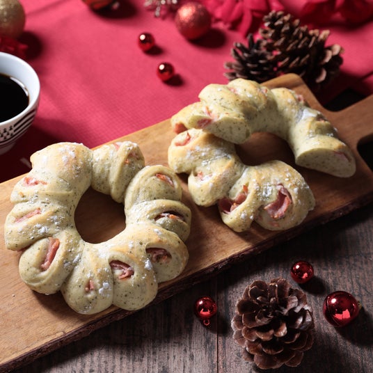 バジルとチーズが香るジェノベーゼソースを練り込んだフランスパンをリース型にしてベーコンを包みました。