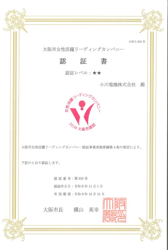 この度、「大阪市女性活躍リーディングカンパニー」の認証を取得することができ、大変光栄に思っております。当社では、女性社員が持つ多様な才能と視点を活かし、組織全体の成長につなげる取り組みを引き続き進めていきます。今回の認証取得を機に、さらに働きやすい職場環境の整備やキャリア支援を強化し、全ての社員が能力を最大限に発揮できる企業を目指してまいります。今後も社会の期待に応えられるよう、社員一同努力してまいります。