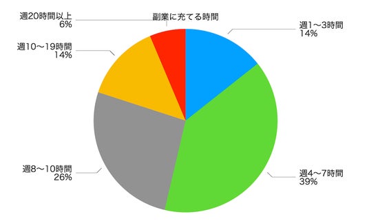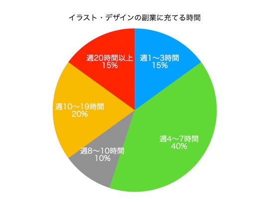 「イラスト・デザイン」でも週4~7時間以下がほぼ同じくらいの割合でしたが、週10時間以上と回答した人が多かったという結果になりました。