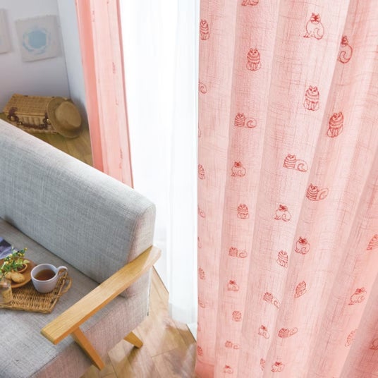 刺繍カーテン(スケッチねこたち・ピンク・麻混)