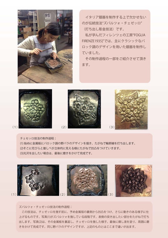ズバルツォ・チェゼッロの技法を用いたシルバージュエリーや室内装飾品、カトラリー等を制作しています。