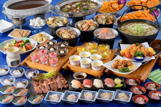 瀬戸内海・宇和海産の新鮮な魚介や愛媛自慢の高級魚「媛スマ」、豊かな自然の中で育てられた国産牛ステーキ、西日本最高峰「石鎚山」の伏流水が育む地元野菜に、柑橘王国えひめならではのフルーツたち。また、今治名物のご当地唐揚げ「せんざんき」などのご当地グルメや、旬を迎えるカキを使ったカキフライ、お子様メニューも充実した、愛媛の食材をふんだんに使ったビュッフェにこの時期の愛媛ならではのグルメがずらりと並びます。