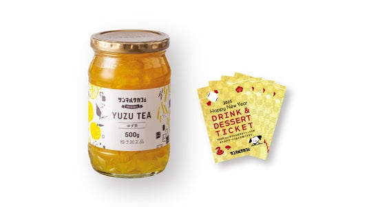 定番ドリンクとして長年愛されるサンマルクカフェのゆず茶をご自宅でもお楽しみいただける、ゆず茶の瓶とドリンク&デザートチケットが3,490円相当入ったお得な福袋。