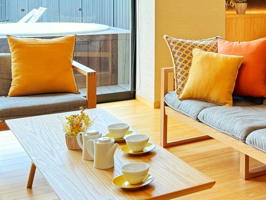 2024年4月に新設した、74平米の広さを誇る極上スイートルーム。室内はあたたかみあふれる竹あかりで照らされ、やわらかな光と自然のぬくもりを感じていただける、とてもゆったりとした空間です。110平米のテラスには、ジェットバス付露天風呂を備えています。ドライヤー・ヘアアイロン、シャワーヘッドは、すべて人気のReFa製品をご用意しています。