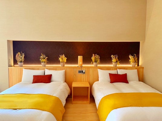 当館では、日頃からロクシタンのアメニティをご用意しており、お客様から大変ご好評いただいています。このたび、2024年に新設したロイヤルルーフトップスイート「昴」において、ロクシタンの世界観をイメージしたコラボレーションルームを、1日1室限定でご用意いたしました。やさしい光に包まれるような、あたたかみのあるイエローを基調とした特別仕様のお部屋です。ラグジュアリーな空間で、癒しのひとときをお過ごしいただけます。