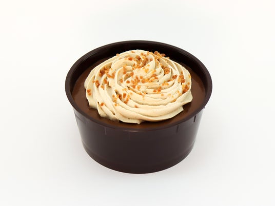 コーヒーの風味をきかせたチョコレートムースに、ミルクチョコレートソースとホイップクリームを重ね、カラメルチップをトッピングしました。