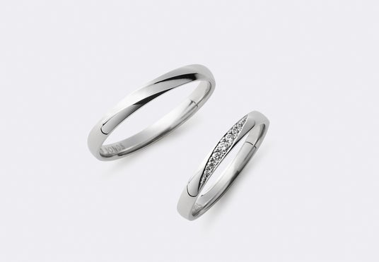 互い違いに入ったメレダイヤモンドの流れと溝のラインは、2本を重ねると繋がるかたちにデザインされています。