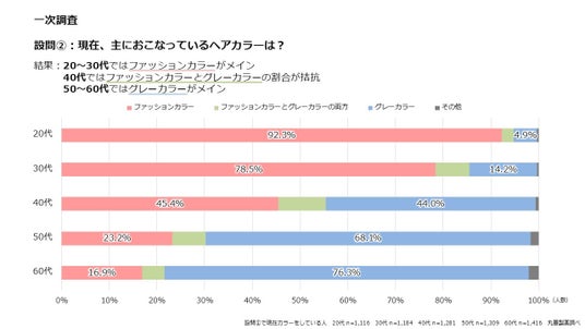 20代では90%以上、30代では80%近くがファッションカラーと回答。40代では、ファッションカラーとグレーカラーの両方と回答する人の割合が増え、ファッションカラーとグレーカラーのみの割合も拮抗。一方、50代、60代では70%前後がグレーカラーとの回答が得られました。