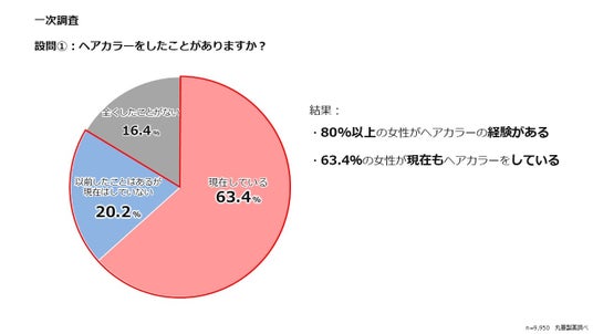 まず、20代から60代の女性約10,000名を対象として、ヘアカラーの経験有無やヘアカラー後の悩みについて一次調査を行い、80%以上の女性にカラーの経験があることが確認されました。