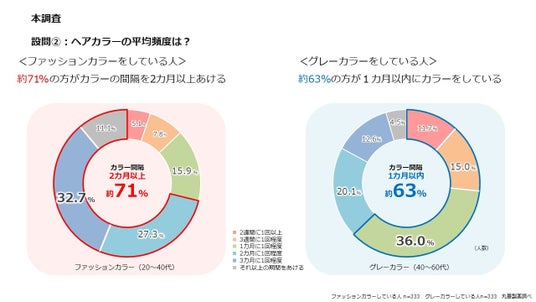 ファッションカラーをしているグループでは2カ月以上に1回の頻度が約71%との回答に対して、グレーカラーをしているグループでは1カ月以内に1回の頻度でカラーするとの回答が約63%となりました。