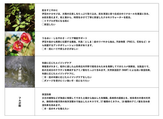 特徴成分:クロモジ / ツバキ花エキス / コメ発酵液 /フルボ酸/トタラ樹皮エキス/ シロキクラゲ多糖体/フィトスフィンゴシン/醤油発酵粕由来のセラミド AP/ヒト型セラミドのセラミド NP※すべて保湿・整肌成分