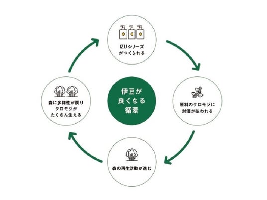【使えば使うほど伊豆が良くなる仕組み】Regenerative な商品を開発し、キー原料 のクロモジの調達を行う、伊豆の森・海が 回復される仕組みにつながっていく。