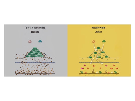 【森の荒廃による海の砂漠化】昭和の人口増時代の植林によりバランスが崩れた森。間伐によって森に日差しが戻り、腐葉土ができ ミネラル豊富な土壌となり、雨水が入り江に。海藻ができ、フノリが育ち、漁場ができる。砂漠化し ていた入り江には再び海藻と微生物が生活を始め、魚介類が、カムバックし始め、森と海が回復していく