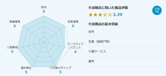 ケアハンティングでは、給与、現場環境、入社後のギャップ、成長環境、人間関係、福利厚生、ワークライフバランスの7つのカテゴリーで数値評価をしており、就業環境の全体バランスが一目で知ることができるため、介護職員の自身が大切にしている転職軸に合わせた情報を提供することが出来ます。