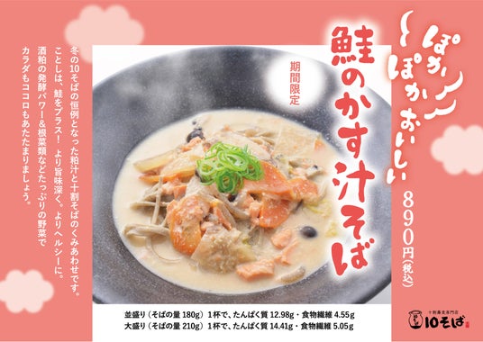 よーじやグループ(京都府京都市下京区、代表取締役・國枝昂)が運営する「十割蕎麦専門店10そば」は、2024年11月29日(金)より期間限定で「鮭のかす汁そば」を提供開始いたします。毎年好評の「粕汁」のおそばに今回は鮭が入って旨味がアップ。根菜類などたっぷりの野菜で食べ応えもしっかりと。カラダもココロもあたためる酒粕の発酵パワーで今年の寒さも乗り越えましょう。また、発売日の11月29日(金)は、「10そばuniqueの日」として、次回来店時に10そばuniqueシリーズをお得にお召し上がりいただけるクーポンを配布いたします。
