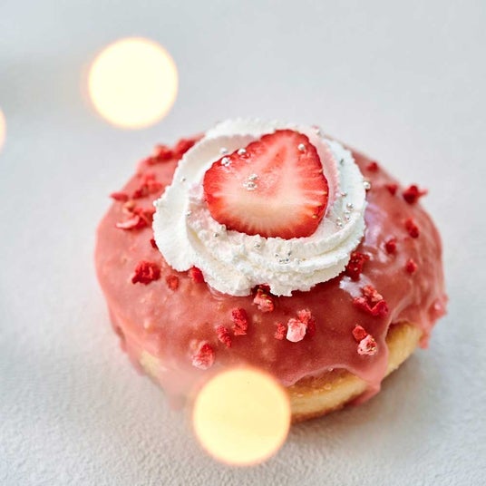 Wストロベリー 500円(税込)いちご好きにはたまらない、クリスマス限定の「Wストロベリー」ドーナツが登場!ブリオッシュ生地のドーナツに、手作りのいちごグレーズをたっぷりとかけ、ホワイトクリスマスをイメージした生クリームをトッピング。その中央にはフレッシュストロベリーをあしらい、さらにフリーズドライストロベリーとアラザンを散りばめて華やかに仕上げました。甘酸っぱいいちごの風味とクリームのなめらかさが絶妙なハーモニーを奏でる一品です。