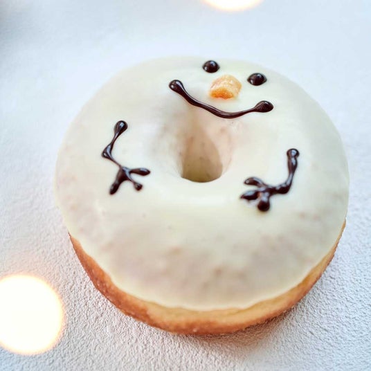スノーマン 450円(税込)クリスマスシーズンにぴったりなスノーマンに仕立てたドーナツ。ふんわりしたブリオッシュ生地のドーナツにホワイトチョコレートでコーティングし、甘さ控えめで上品な味わいに仕上げています。かわいらしいデザインは、お子様から大人まで思わず笑顔になれる一品。お友達やご家族へのプレゼントにも最適です。