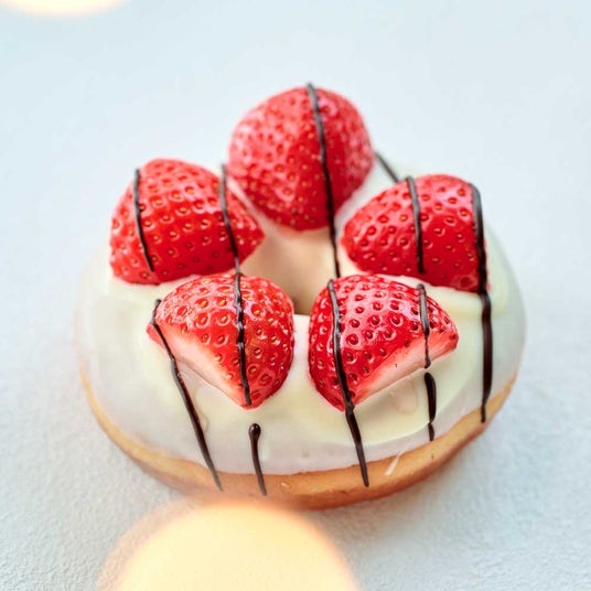 ストロベリーフラワー 520円(税込)華やかで贅沢な「ストロベリーフラワードーナツ」は、クリスマス時期だけの特別な一品です。ふんわりとしたブリオッシュ生地をホワイトチョコレートでコーティングし、トッピングには新鮮ないちごを丁寧にお花のようにトッピングしました。贅沢にあしらわれたフレッシュストロベリーが、甘く香るホワイトチョコと絶妙にマッチ。見た目も味わいも華やかで、クリスマスのテーブルを彩ります。