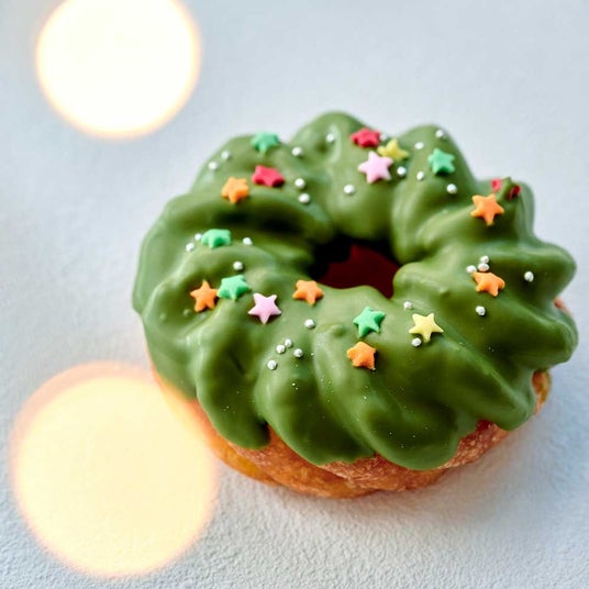 クリスマスリース 450円(税込)クリスマスの雰囲気をそのままに、フレンチクルーラーを華やかなリースにアレンジしました!抹茶チョコレートでコーティングしたクルーラーに、星型のスプレーチョコを散りばめて、まるでクリスマスリースのような仕上がりに。抹茶のほろ苦さとクルーラーの軽やかな口当たりが絶妙なバランスを生み出します。クリスマスパーティーの手土産や、ご自身へのご褒美スイーツにぴったりの一品です。