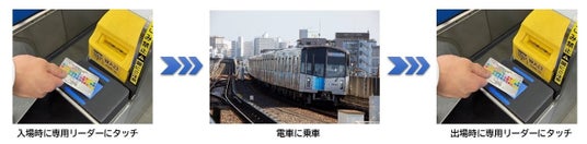 この乗車サービスでは、交通系ICカードへのチャージやきっぷの購入が不要となり、お客様がお持ちのタッチ決済対応のカード(クレジット、デビット、プリペイド)や、同カードが設定されたスマートフォン等を、自動改札機に新たに設置する専用リーダーにタッチすることで、改札を通過しご乗車いただけます。