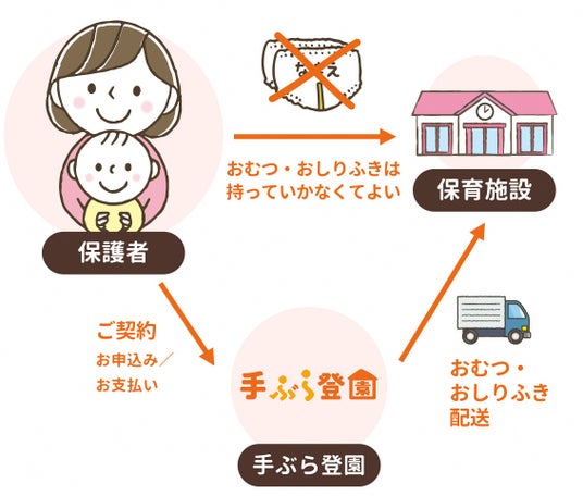 「手ぶら登園」の導入により、保育施設に直接紙おむつとおしりふきが届くため、保護者は紙おむつに名前を書く手間や、持参する手間が無くなります。また園も紙おむつの個別管理が無くなるため、保育士の業務の負担が軽減され、子どもと向き合う時間を増やすことができます。