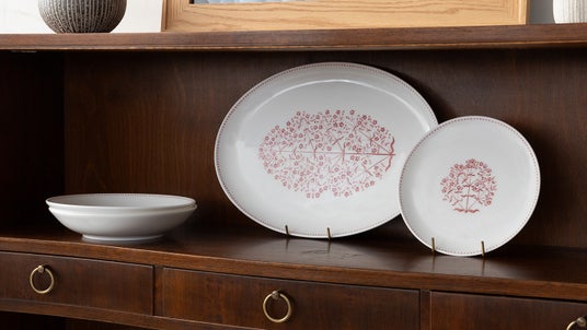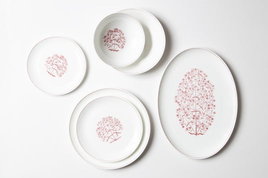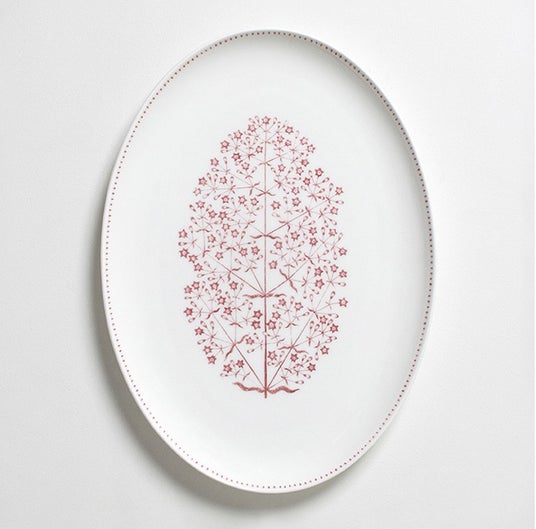 戦後間もない1948年頃、模様入りの陶器が一般的であった海外市場向けにデザインされた、大変貴重な絵柄付きの一群です。絵柄の由来は定かではありませんが、この繊細なモチーフは柳宗理自身によって描かれたものであり、当時の釉薬に溶け込んだ表情をイングレーズ加工という技法を用いて、焼成後の仕上がりを確認しながら純白のNIKKO FINE BONE CHINA(ニッコーファインボーンチャイナ)に再現しています。ニッコーの高度な転写技術により、75年の歳月を経てリデザインされたシリーズです。