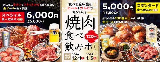 ワタミ株式会社(本社:東京都大田区、以下ワタミ)が全国で展開する、高品質な焼肉をリーズナブルな価格で提供する「焼肉の和民」は、2024年12月1日(日)から2024年の忘年会プランとして2種の食べ飲み放題プランを販売いたします。プランはそれぞれ大人気の牛タンもワタミカルビも食べ放題の「食べホ スペシャル」プランと「サントリー生ビール」をはじめ「ジムハイ」や「レモンサワー」まで飲み放題の「飲みホ スタンダード」をセットとした「スペシャル 食べ飲みホ」プラン(おひとり様税込6,600円)と、焼肉の定番100品以上が食べ放題の「食べホ スタンダード」プランと同じく「飲みホ スタンダード」をセットとした「スタンダード 食べ飲みホ」プラン(おひとり様税込5,500円)で、ともに食べ放題×飲み放題を楽しみ尽くすのに十分な120分でご用意しました。