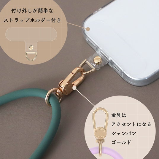 ストラップホルダーはケースへの挟み込むだけ、ストラップとホルダーもワンタッチで付け外しが簡単。