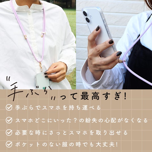 柔らかく太めの丸紐形状となっており、スマホを付けた状態でも肩に食い込むこともありません。